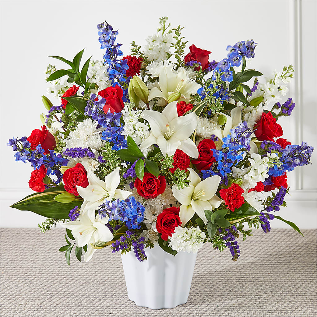 A collection of red roses, blooming white lilies, and blue delphinium come beautifully arranged by your local florist to beautifully accent a service.